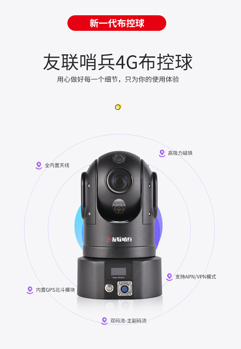 友聯(lián)哨兵4G高清布控球是一款功能全面、攜帶方便的無(wú)線視頻4G應(yīng)急布控球產(chǎn)品,超高設(shè)備集成度,內(nèi)置高性能鋰電池組,具備防水防震的特性,可滿足臨時(shí)布控和快速安裝的特殊要求。